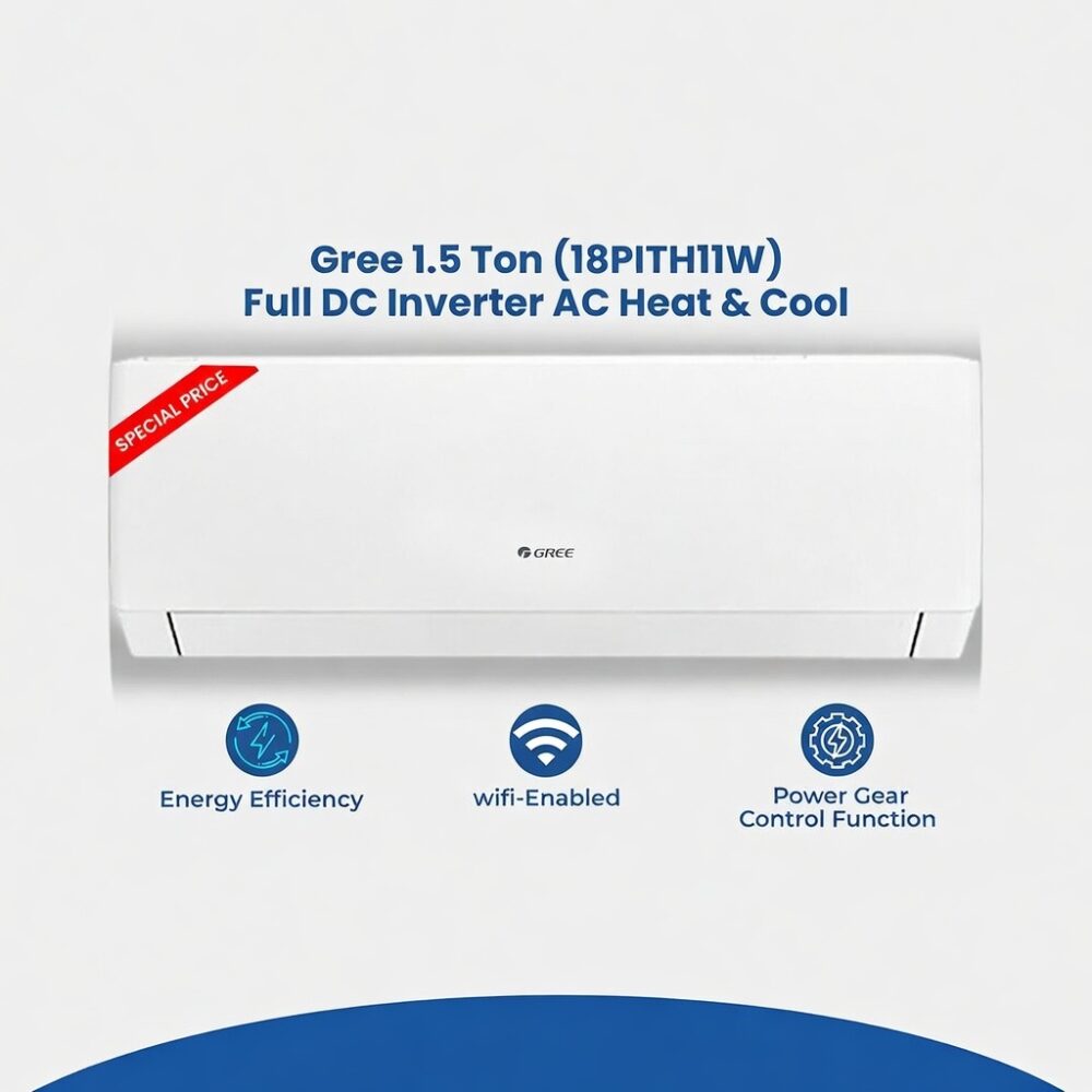 The Gree GS-18PITH11W belongs to the Pular Series, designed for both cooling and heating. It combines elegant aesthetics with advanced inverter technology, making it ideal for Pakistan’s hot summers and cold winters.