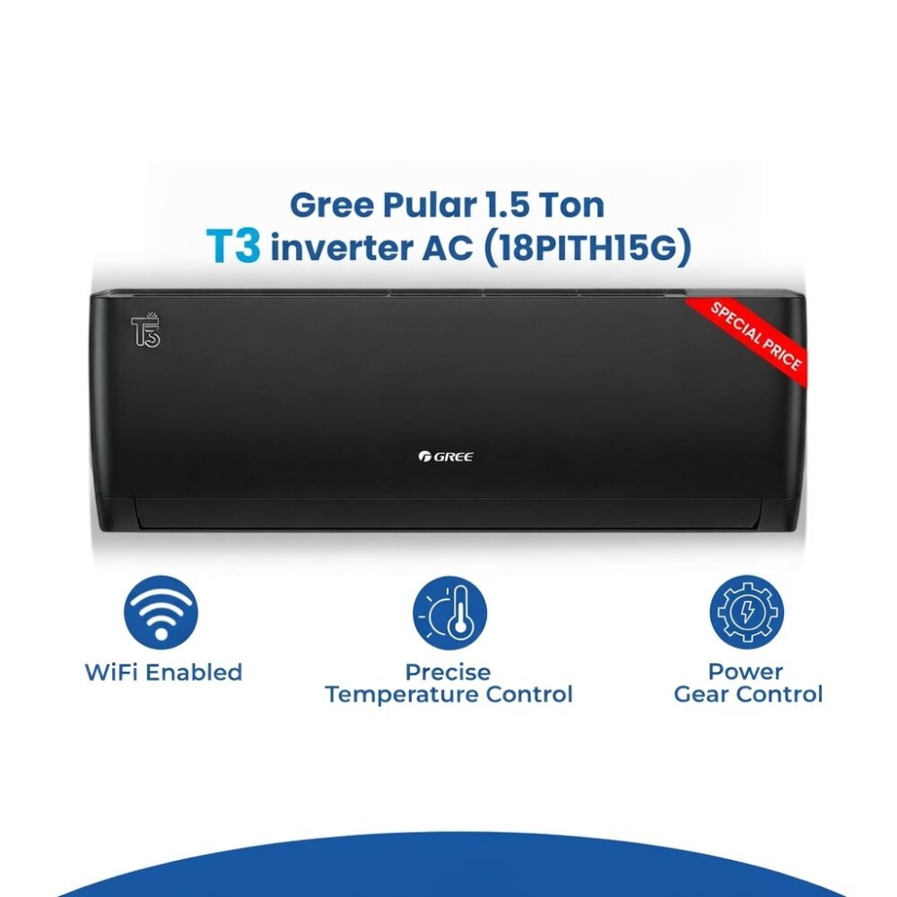 Gree GS‑18PITH15‑G‑T3 is one of the most popular 1.5 Ton inverter ACs in Pakistan, built for high performance in extreme climates. With Wi‑Fi smart control, heat & cool functionality, and advanced G10 inverter technology, it ensures powerful cooling, reliable heating, and up to 60% energy savings.